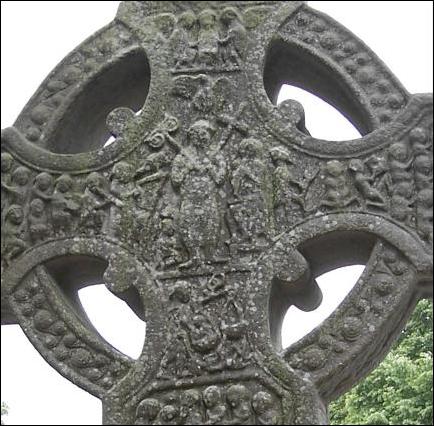 Another Christian image, not directly connected to one particular text, is the Last Judgment. There are a number of texts this image might be related to including Matthew 25: 31ff, The Judgment of the Nations. One of the finest examples of the Last Judgment is found on the Cross of Muiredach at Monasterboice (see below). Kees Veelenturf writes that this cross has the most elaborate depiction in Irish art of the Last Judgment. (Veelenturf 104-107) Peter Harbison describes the scene: “In the centre, Christ stands with outspread feet and wearing a long robe to below the knees. There is an eagle above his head, with its head to the left and its left wing expanded. Christ carries a cross-staff over his left shoulder, and a blossoming scepter over his right. To the left of his feet there is a kneeling angel holding a book, and with another book above its head. Beside the angel, and looking to the right towards Christ, a harper – presumably David – sits playing the instrument which rests on his knees, while a bird perches on top of it and whispers into his ear – the inspiration of the Holy Spirit. Behind him is a man playing a flute-like wind instrument, while behind him