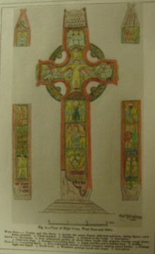 In these colored pencil paintings, using Westropp’s line drawings as a coloring book, I have tried to suggest what the painted crosses may have looked like. As much as possible I used colors that were used in the Book of Durrow. In each coloring I have tried different sets of colors. For additional information on the cross see Offaly Crosses.