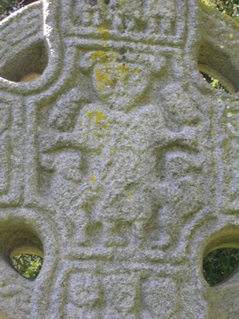 The South Cross is unusual in that there appears to be a crucifixion scene on each face of the head of the cross. Like the image on the east face there is little detail visible. Jesus’ head appears to be up but details of his face and head are not clear. His arms are stretched out and he is clothed in a short tunic. His legs are apart. No nails are visible.