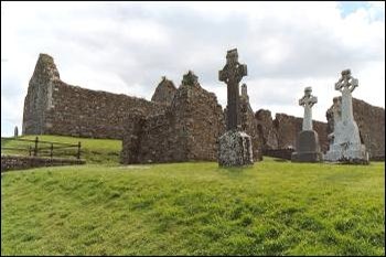 Knowing the physical characteristics of the Irish High Cross (with all of the variety we have seen above) will not guarantee a confident identification of an authentic Irish High Cross. Cemeteries surround the ruined buildings of many of the ancient Irish monasteries, and many of the grave markers look like the ancient Irish High Crosses (some of these are several centuries old, some as recent as yesterday). Clonmacnois in County Offlay offers one example. The three visible crosses in the photo to the left are all in the style of the Irish High Crosses but are not Irish High Crosses. They are more recent grave markers.