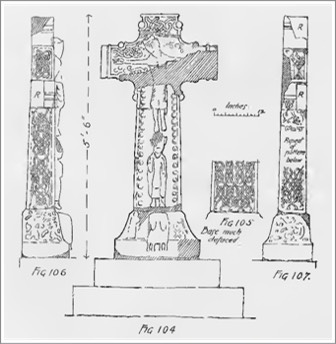 Cross: The shaft has irregular interlace with tendril endings. (See Fig. 105 above) The head has floral motifs flanked by raised mouldings.